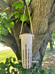 This unique Peanut Bird Feeder is made with Coffe Husks. The Earthy Sustainable line processes agricultural waste blending it with resin. A lot of time energy and water goes into growing crops yet most of the plant goes unwanted and would normally be burnt releasing harmful CO2 into the environment. Instead the waste material is processed to create Earthy sustainable products. None of the ingredients are grown specifically for Earthy. The unwanted parts of commercially-farmed crops are used to make our feeders. These products are frost proof and suitable for outdoor and indoor use. Lifespan 2-3 years. Dimensions are 9.25" x 3.25"Dia.