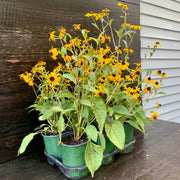 Black-Eyed Susan is a native herbaceous perennial with an upright clumping habit and dark green narrow foliage. The large daisy-like gold flowers have a black-brown center disk and bloom from mid-summer until frost. Flowers best in full sun and consistent moisture. Drought tolerant once established.