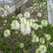 Mount Airy Fothergilla is a dwarf deciduous shrub with a strong upright habit and profuse blooms. The leathery dark green foliage with blue-grey undersides turn various shades of yellow, orange, and red-purple in fall. The bottlebrush-like spikes densely packed with fragrant white flowers bloom through spring. Blooms best in rich, moist well-drained acidic soils.
