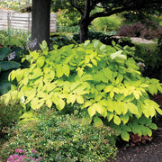 Sun King Golden Japanese Spikenard is a fast-growing compact perennial with a rounded habit and coarse toothed golden yellow compound leaves in part sun or chartreuse to lime green with more shade. Tiny white flowers top the foliage in summer and are followed by purple-black berries in fall. Color is best in part sun and moist, fertile well-drained acidic soils.