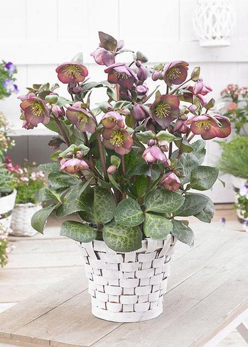 Helleborus x Frostkiss® Vibey Velvet™ Frostkiss® Vibey Velvet™: Patent PPAF Heat tolerant Attractive, marbled foliage Large, burgundy flower blo...