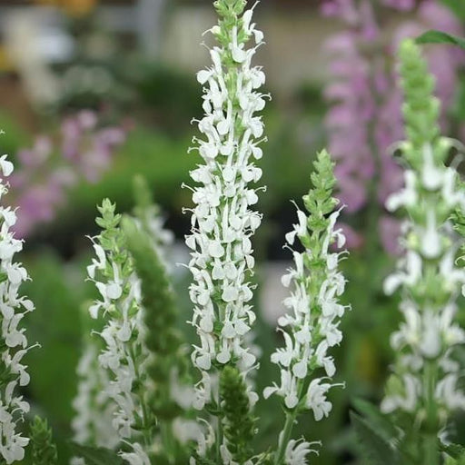 Snow Hill Meadow Sage is a compact upright herbaceous perennial with aromatic medium green foliage. Tall spikes holding pure white two-lipped flowe...