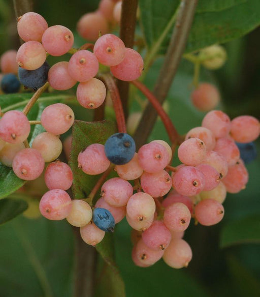 Viburnum nudum Winterthur Winterthur Witherod Viburnum Dense, rounded form Attracts birds Blue to black berries in late summer Large, fragrant whi...
