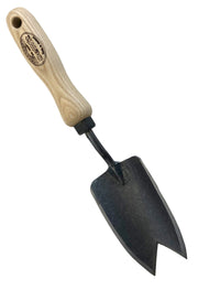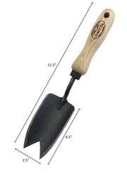 DeWit 2-Pointed Trowel works like a standard trowel but the 2 sharp points break up soil quickly and easily. Great for tough soil and clay. Made from hardened boron steel and heat-treated for strength it is the perfect gardening companion. Made for smaller hands it's a popular choice for women or seniors! Handle is made of hardwood ash and harvested from environmentally responsible FSC-certified forests. Manufactured in Holland this tool is guaranteed a lifetime! Head: 4.5"L x 2.5"W Total: 11.5"L 0.4 lbs
