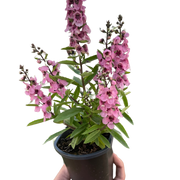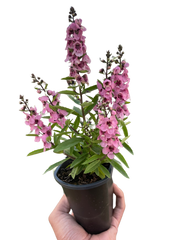 - Description: Angelonia angustifolia, commonly called Angelonia or summer snapdragon, is native to Mexico and the West Indies. It is an upright, glabrous, somewhat bushy, tropical perennial that is noted for its long summer bloom of small snapdragon-like flowers. Plants typically grow 12-18” tall. Stems are clad with narrow, oblong to lanceolate, green leaves (to 3” long) with toothed margins. Foliage is slightly aromatic. Bluish-purple flowers (each to 3/4” across) bloom from late spring to early fall in narrow terminal spikes (to 8” long). The two-lipped flowers are somewhat reminiscent of snapdragon. Cultivars are available in white, blue, light pink and bicolor flower colors.