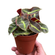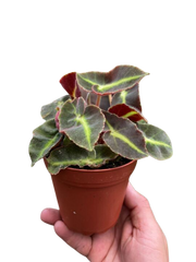 Begonia 'Striped', is a flowering shrub-like plant native to Brazil. It has compact growth, velvet leaves, and a bright green stripe down the center of each leaf. The underside of the leaves is a rich mahogany color. The plant also has white flowers