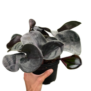 - Description: Geo has unique color and texture. The tops of the leaves are a glossy dark green, whereas the undersides are velvety, dark, and purple-black. Geo’s leaves are thick, making it perfect for an indoor environment. Plants with thicker leaves tend to transpire (lose moisture) more slowly, making them less likely to get brown edges.