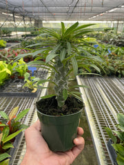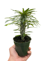 - Description: This striking houseplant hails from Madagascar and because it has leaves growing around the crown this combination gives rise to the common name of Madagascar Palm. Pachypodium means "thick foot" and refers to the thick swollen stem that stores water and gives the plant structure and strength.