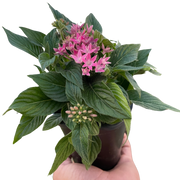 Description: Pentas are upright, herbaceous perennials that can grow up to 6 ft (1.8 m) tall and wide in their native grasslands of East Africa and Yemen. In backyard gardens, they are usually 1–2 ft (30–60 cm) tall, but can grow larger with flower clusters up to 5 in (13 cm) in diameter. Pentas have simple leaves with prominent veins on the underside and may be variegated. The leaves and stems are covered with fine hairs. In dense clusters, the flowers are long-tubed and star-shaped, and can be red, pink, white, magenta, or lilac. The name genus comes from the Greek word pentas which means "a series of five", with reference to the flower parts being in fives instead of fours