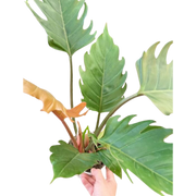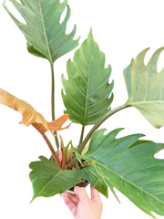- Description: The Philodendron Caramel Pluto, is a compact, hybridized philodendron with V-shaped leaves that develop serrated edges as they mature. The leaves are caramel-colored when they first appear but eventually fade to a rich green or dark green with a brown tint. The plant's stems are dark red, and it has glossy leaves