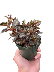 • Description:Peperomia ‘Metallica’ is an evergreen succulent plant featuring plump, leathery, cupped leaves with greenish black leaves, center silver streaks and red wine-colored undersides. The trailing stems appear upright at first, but eventually spill over do to their own weight. Displays small, creamy yellow, mouse-tail blooms in late summer to fall.