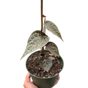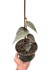 • Description: The Piper Crocatum is a one-of-a-kind plant that is difficult to come by. This plant is native to Peru. These vining plants' thick, glossy leaves dazzle the eye, making them a striking item. The olive green heart-shaped leaf is speckled with pink along with the veining. It's a vining plant that loves to climb on moss poles and stakes.