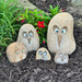 This adorable Family of Boulder Angry Birds would be a great addition around your garden or in your home. They also make perfect gifts! They are made from Natural Granite Boulder with inlaid quartz eyes. Since each boulder pet is hand carved it is unique in shape and color. This 5 piece set includes two 3-4" 1-2lb one 6" 3-4lb one 8" 15-17lb & one 12" 32-34lb Angry Bird. Height and weight are approximate.