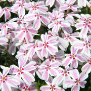 Candy Stripes Creeping Phlox is a creeping low-growing evergreen perennial with dark green awl-shaped foliage and cascading stems. The dense carpet of fragrant white flowers with broad pink center stripes and small crimson eyes bloom in late spring to early summer attracting butterflies. Best flowering in full sun and rich, moist, well-drained soils.