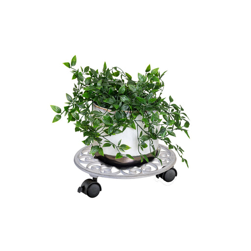 Wagner Round Plant Caddy in timeless cast iron insteel with a flower design. Twin wheel smooth-rolling casters glide easily over carpets and floor...