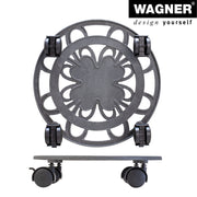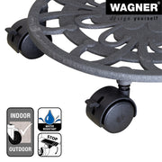 Wagner Round Plant Caddy in timeless cast iron in a slate gray shade. Twin wheel smooth-rolling casters glide easily over carpets and floors without marring or tipping. Casters are equipped with brakes for safe positioning. Water resistant finish so it can be used indoors or out. The Wagner company located in southern Germany near the Black Forest has earned a reputation for exceptional quality. With over 40 years experience in design and manufacturing their products are rigorously tested for quality safety and durability. 110 lbs. capacity 11.4"D x 2.25"H 3.8 lbs.