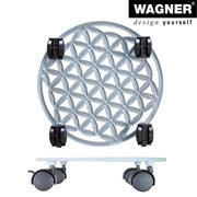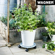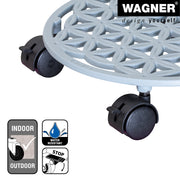Wagner Round Plant Caddy in timeless cast iron in a smoky blue-grey shade. Twin wheel smooth-rolling casters glide easily over carpets and floors without marring or tipping. Casters are equipped with brakes for safe positioning. Water resistant finish so it can be used indoors or out. 110 lb capacity 11.4" diameter. The Wagner company located in southern Germany near the Black Forest has earned a reputation for exceptional quality. With over 40 years experience in design and manufacturing their products are rigorously tested for quality safety and durability.