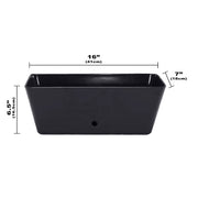 Worlds first Bamboo Fiber self-watering pot this 16" Black Rectangular self-watering planter is made from sustainable biodegradable all natural Bamboo Fiber and corn starch. Plants thrive in this natural Bamboo Fiber planter that is plastic free. The soil is better aerated by the unique water well in the base allowing better nutrient management helping the plants grow healthy and strong. These planters should be treated like ceramic suitable for use in hot or cold climates inside or outside. At initial planting water from the top until water is just below the overflow. Then periodically check the water level in the base and add water to the well from the bottom access or from the top of the planter. The soil draws water up from the well as needed using capillary action just like a wick. No more overwatering strong healthy plants is the result! Everyone gets a "green thumb" growing in bamboo planters and just by keeping water in the well! When you are finished with your planter just break it up and put into your compost bin. Over time the material will degrade back to nature.
