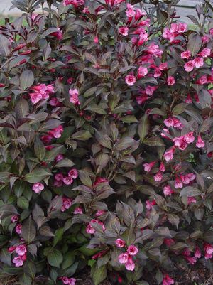 WEIGELA `SPILLED WINE` Color: Pink Shades Height: 18-24 Inches Spread: 24-36 Inches Zone: 4-8  Dark purple foliage Pink spring flowers Broa...