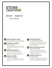 Granite boulder. Natural boulder body with hand-carved accents. Each cat has its own unique characteristics. Since each boulder pet is unique height and weight are approximate. 12" H 42-44 lbs