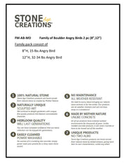 This adorable Mom and Dad Boulder Angry Birds Set would be a great addition around your garden or in your home. They also make perfect gifts! They are made from Natural Granite Boulder with inlaid quartz eyes. Since each boulder pet is hand carved it is unique in shape and color. This 2 piece set includes a 8" 15-17lb & 12" 32-34lb Angry Bird. Height and weight are approximate.
