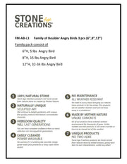 This adorable Family of Boulder Angry Birds would be a great addition around your garden or in your home. They also make perfect gifts! They are made from Natural Granite Boulder with inlaid quartz eyes. Since each boulder pet is hand carved it is unique in shape and color. This 3 piece set includes a 6" 3-4lb 8" 15-17lb & 12" 32-34lb Angry Bird. Height and weight are approximate.