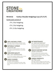 This adorable Family of Boulder Hedgehogs would be a great addition around your garden or in your home. They also make perfect gifts! They are made from Natural Granite Boulder with hand carved details that make each hedgehog one-of-a-kind. Since each boulder pet is hand carved it is unique in shape and color. This 3 piece set includes a 4" 1-2lb 6" 3-4lb & 8" 15-17lb Boulder Hedgehog. Height and weight are approximate.