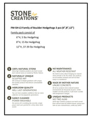 This adorable Family of Boulder Hedgehogs would be a great addition around your garden or in your home. They also make perfect gifts! They are made from Natural Granite Boulder with hand carved details that make each hedgehog one-of-a-kind. Since each boulder pet is hand carved it is unique in shape and color. This 3 piece set includes a 6" 3-4lb 8" 15-17lb & 12" 37-39lb Boulder Hedgehog. Height and weight are approximate.
