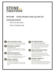 This adorable Mom and Dad Boulder Turtle Set would be a great addition around your garden or in your home. They also make perfect gifts! They are hand carved from Natural Granite Boulders making each turtle unique in size and color. This 2 piece set includes a 10" 9-11lb & 14" 27-29lb Boulder Turtle. Height and weight are approximate.