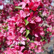 We may be far from the prairie, but this spectacular specimen is right at home here in any New England landscape. It's got what it takes to stop you in your tracks with dense, rounded, carefree form, excellent disease resistance, and amazing bright fuchsia buds that will become clear deep red/pink fragrant flowers before your very eyes in early May complementing the unusual purple new growth that is just emerging. Mature leaves are eye catching, too with red tinged veins and petioles against a deep reddish-green leaf body that turns an attractive orange in autumn. Small, persistent red berries complete the picture on this stunning plant that will thrive in full sun.