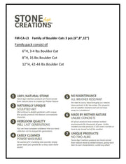 This adorable Family of Boulder Cats would be a great addition around your garden or in your home. They also make perfect gifts! They are made from Natural Granite Boulder with hand carved accents. Since each boulder pet is hand carved it is unique in shape and color. This 3 piece set includes a 6" 3-4lb 8" 12-14lb & 12" 42-44lb Boulder Cat. Height and weight are approximate.