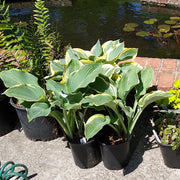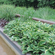 First Frost Hosta is a shade-loving herbaceous perennial primarily grown for their foliage.  The large basal leaves are deeply veined blue-green with a wide creamy-yellow edging that matures to white.  The bell-like pale purple flowers raise up in terminals from the rootstalk above the mound in mid-summer attracting butterflies.  Best bloom in partial sun and moist well-drained soils.  First Frost is resistant to slug damage.