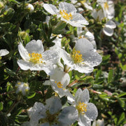 Happy Face White Potentilla is a compact herbaceous perennial with tiny dark green foliage.  Small white flowers with cheery yellow centers bloom from spring through summer.  Grows best in full sun and moist well-drained soil.