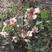 Ivory Prince Lenten Rose is a late winter-blooming evergreen perennial with glossy dark blue green basal foliage. Clusters of burgundy buds open to small nodding creamy white flowers that earn tones of chartreuse on the inside of the petals and soft pink on the outside bloom on red stems from late winter to mid spring. Best bloom in dappled sun and moist well-drained soils. All parts of the plant are toxic if ingested.