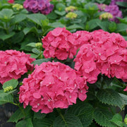 Big Band Hydrangea is a dwarf fast-growing deciduous shrub with a rounded habit and serrated dark green leaves with no fall color. Its mophead flowers bloom on both new and old wood with color that depends on the soil PH - acidic soils produce violet-blue flowers, while neutral or alkaline soils produce saturated pink flowers- and rebloom continuously through summer. The flowers attract butterflies and pollinators. Best bloom in partial sun and rich, moist well-drained soils. The Lets Dance series has an early rebloom, improved hardiness, and tightly compact habit.