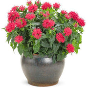 Pardon My Cerise Bee Balm is a dwarf herbaceous perennial with upright stems and aromatic serrated dark green foliage. The full sized dark cherry pink fringe-like flowers blooms in whorls at the top of the thick stems in summer, attracting bees and butterflies. Best bloom in full sun and well-drained soil. Has good resistance to powdery mildew.
