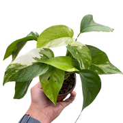 - Description: One of the rarest pothos, White Variegated Epipremnum ‘Albo- Variegata’ showcases creamy whites and lush greens that create a truly breathtaking houseplant. The juvenile leaves are narrow and oval-shaped, but as the plant matures and the leaves become larger and fenestrated so it looks somewhat similar to White Monstera. Provide a moss pole or trellis for the plant to climb and grow in partial sun or bright, indirect light. Fertilize with a dilute solution of balanced fertilizer during the active growing season. Let the top of the soil dry between watering to keep this plant thriving.