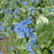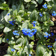 Sea Heart Siberian Bugloss is a compact shade loving herbaceous perennial primarily grown as a groundcover for its large heart shaped with molted silver foliage with dark green veining. Airy branching clusters of sky blue forget-me-not like flowers that fade to pink or lavender bloom above the foliage in spring. Flowers best in part shade and rich, consistently moist well-drained soils.