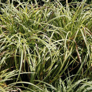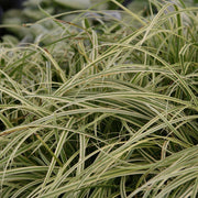 Silver Septre Sedge is a shade loving evergreen grass with narrow arching green foliage with yellow margins. Small greenish-brown flower spikelets on triangular stems bloom in mid spring. Prefers part sun and moist well-drained soils.