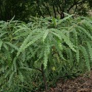 Sweet Fern is an upright spreading native deciduous shrub with deeply notched aromatic dark green foliage resembling a fern frond and turns a nice red before browning in fall. Its insignificant greenish flower blooms in spring and is followed by brown burr-like nuggets. Easily grows in average well-drained soil. Drought tolerant.